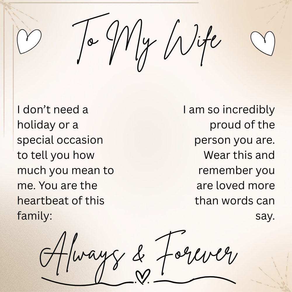 Message Card – To My Wife, I don’t need a holiday or a special occasion to tell you how much you mean to me. You are the heartbeat of this family. I am so incredibly proud of the person you are. Wear this and remember you are loved more than words can say. Always & Forever
